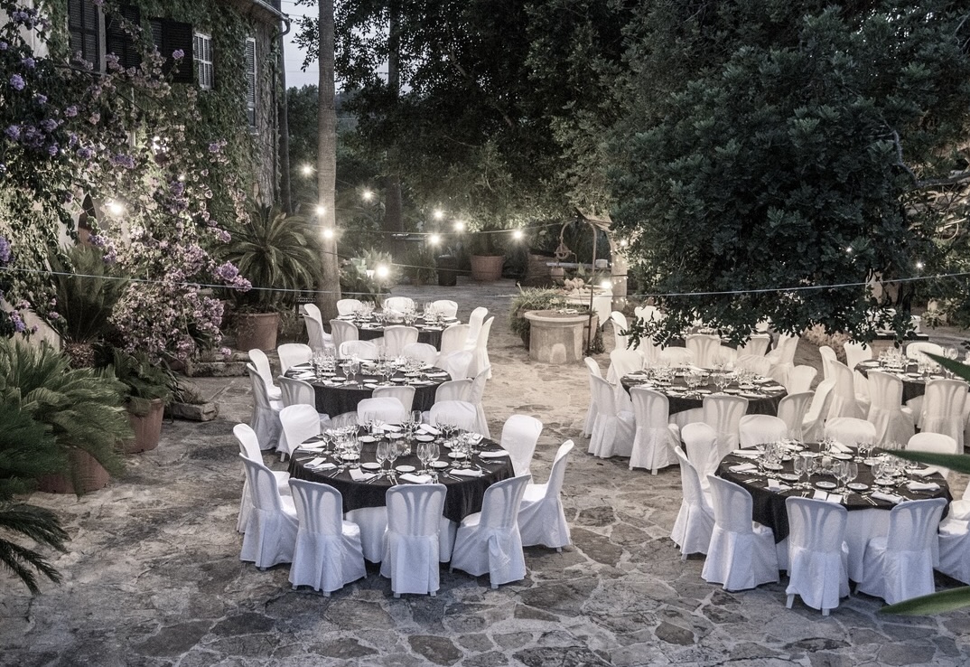 Ein wunderschöner Outdoor-Bereich auf Mallorca, mit stilvoll dekorierten Hochzeitstischen. Perfekt für eine elegante Feier unter freiem Himmel.
